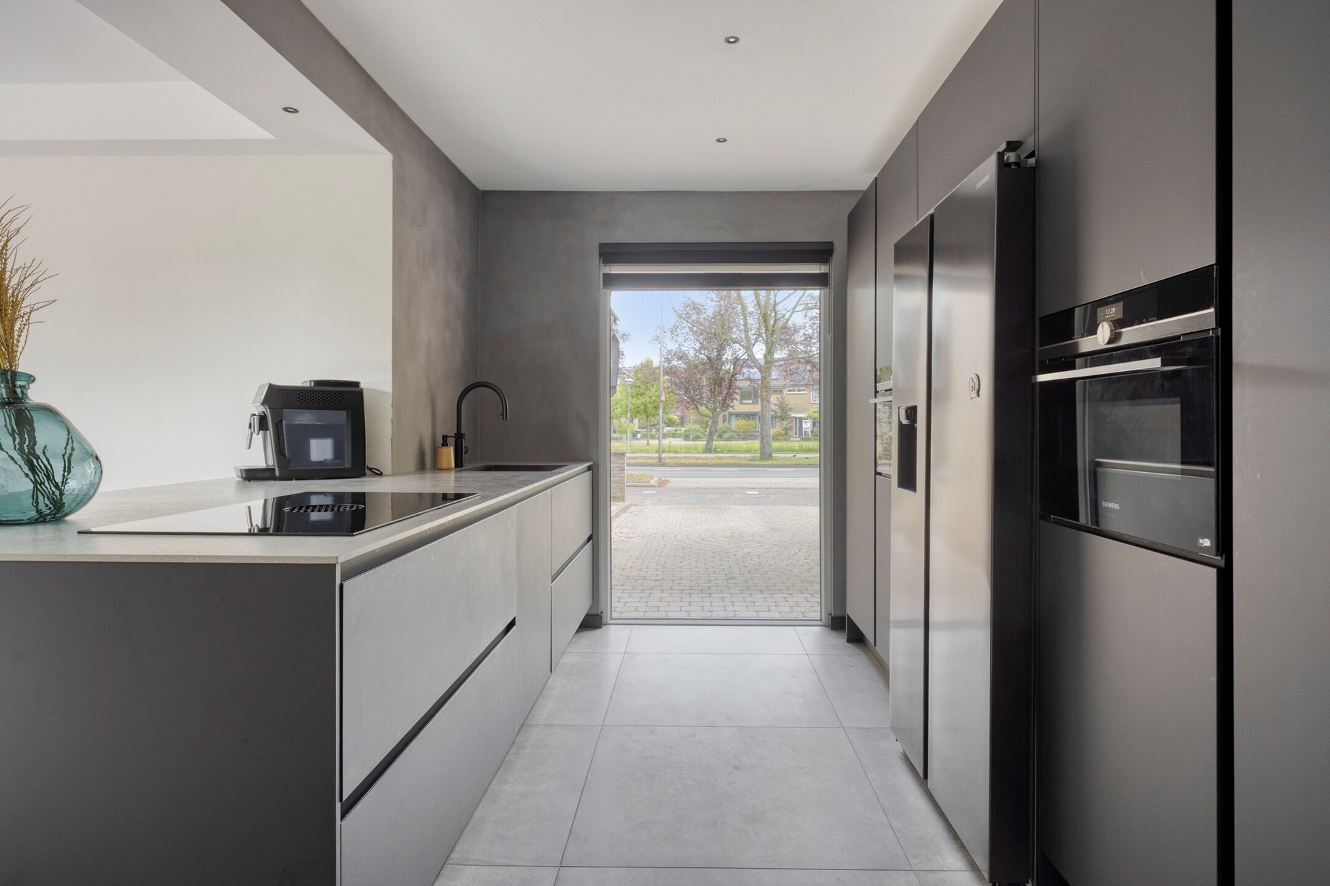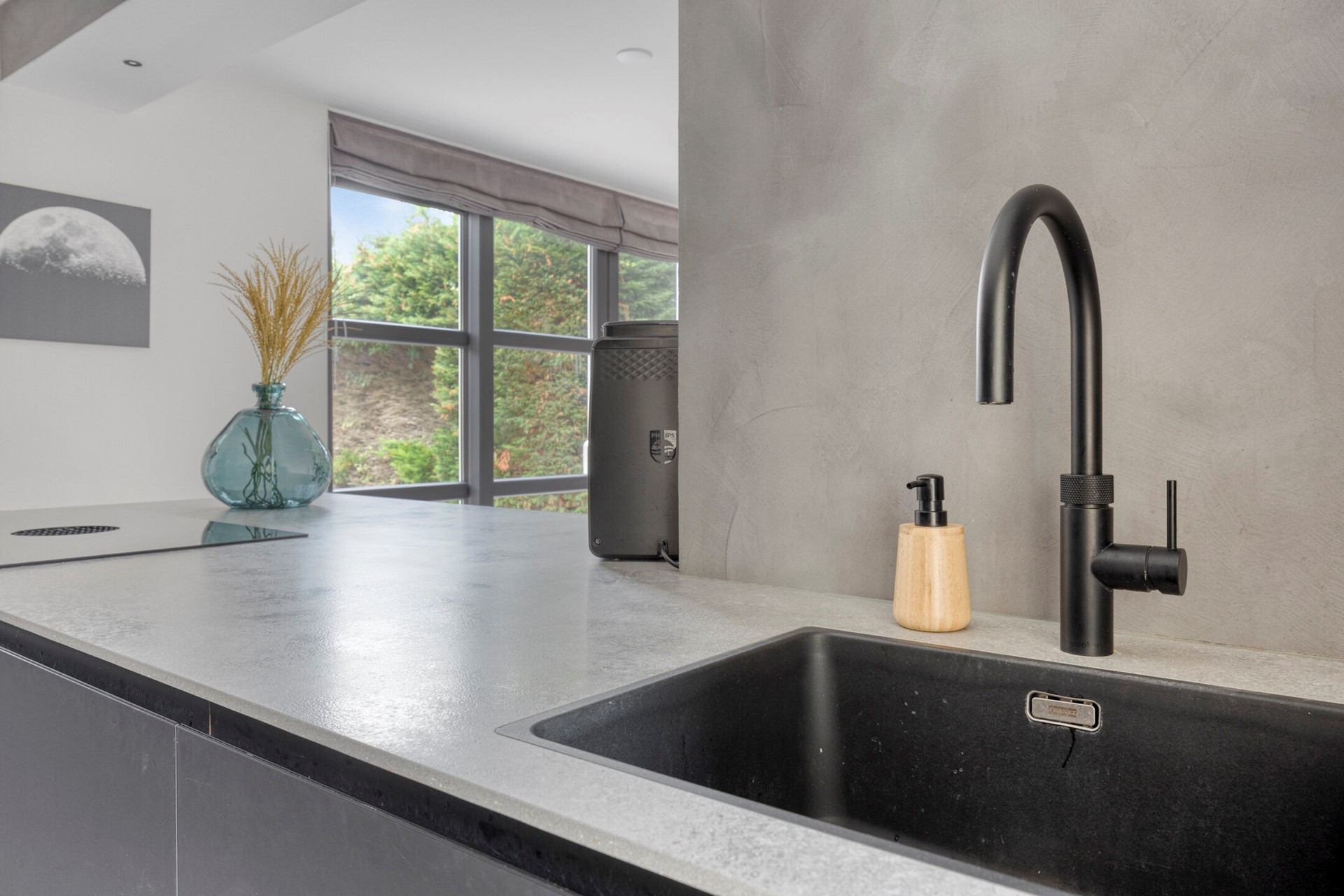 Deze keuken, geplaatst in 2022,, is een waar paradijs voor kookliefhebbers. Uitgerust met een schiereiland en een grote kastenwand biedt de keuken niet alleen veel werk- en opbergruimte, maar ook hoogwaardige apparatuur: een grote Amerikaanse koel-vriescombinatie, Bora inductiekookplaat, Quooker, stoomoven en oven-combi. De wanden zijn stijlvol afgewerkt met beton ciré, wat de ruimte een moderne en luxe uitstraling geeft.