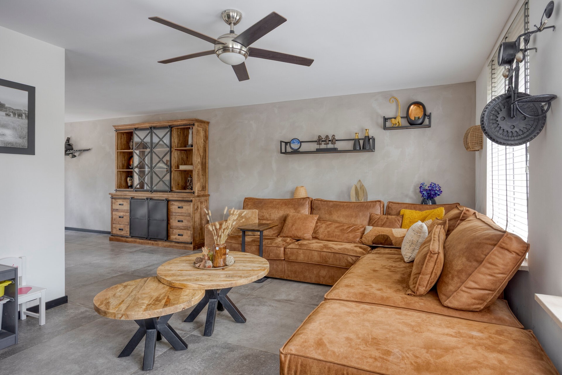 De woonkamer strekt zich uit over de volledige lengte van de woning en voelt heerlijk licht en ruim aan. Aan de voorzijde vindt u het zitgedeelte, terwijl aan de achterzijde de royale leefkeuken is gesitueerd.