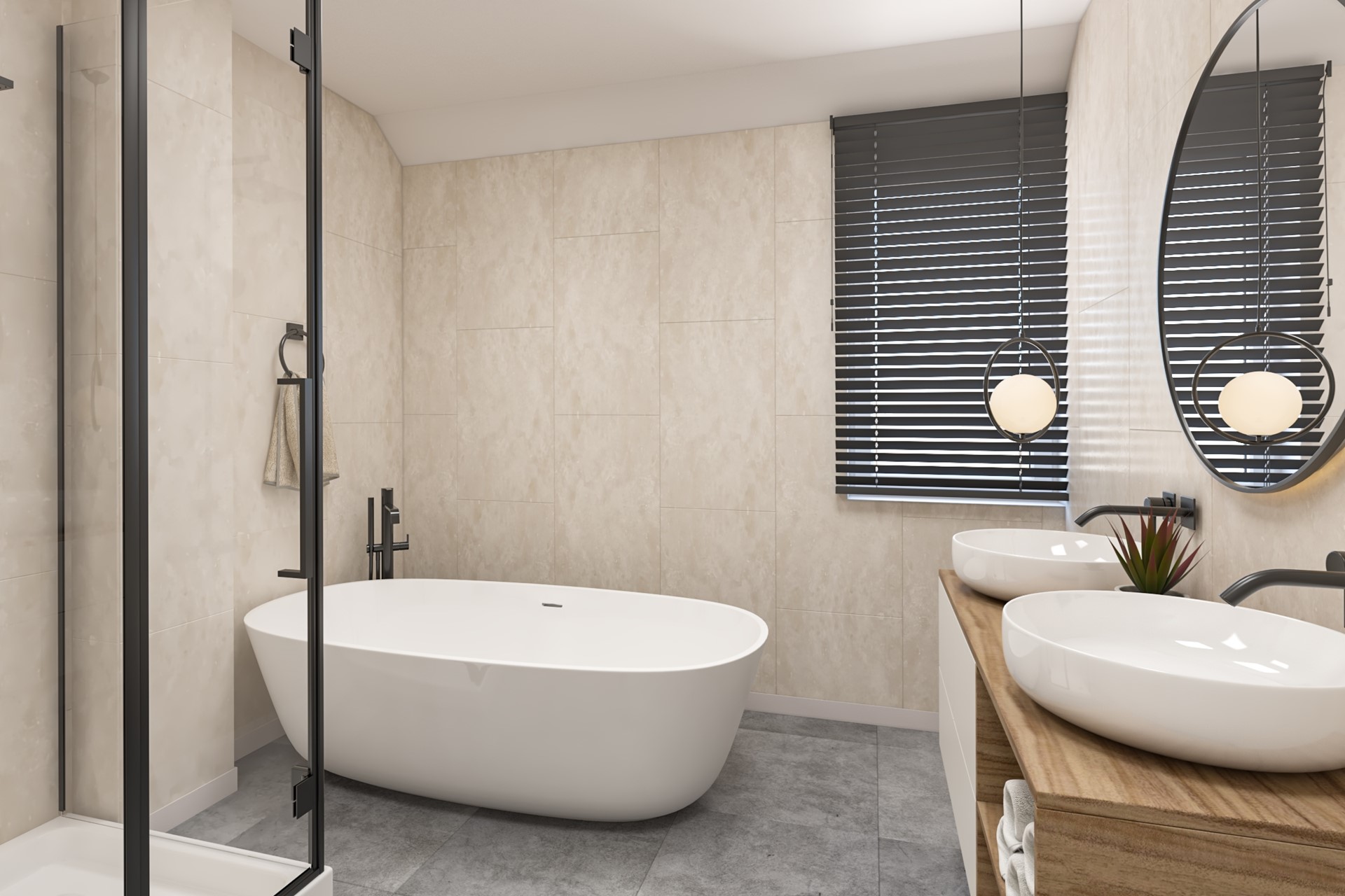 De badkamer is ruim van opzet, uitgevoerd in een lichte kleurstelling en voorzien van een ligbad met douchefunctie, een zwevend wastafelmeubel en een designradiator.